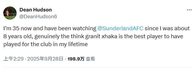 英超升班马桑德兰本赛季开局表现出色, 6轮仅1负目前排名前5。球队新援、队长扎卡的出色表现引发了一位27年桑德兰本土老球迷的赞叹。