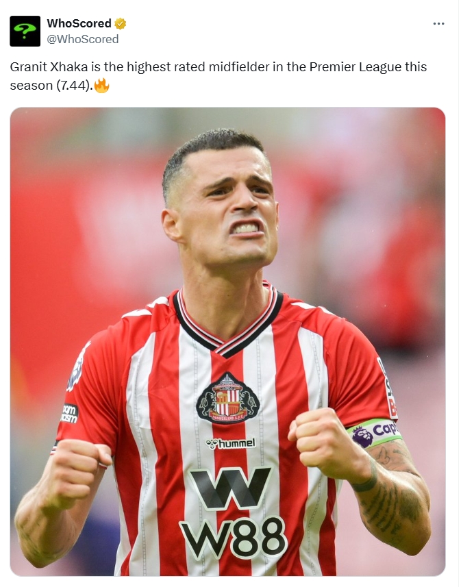 33岁的瑞士中场扎卡本赛季为桑德兰出战了6场比赛,贡献3个助攻。六场比赛他获得的sofascore评分分别为:6.6、6.9、7.5、7.7、6.9以及8.5。另一家评分机构WhoScored的数据则显示扎卡是英超本赛季目前为止评分最高的中场球员。
